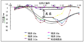 ②深井覆岩体内浆体高压充填控制覆岩运动关键技术。根据理论研究、室内试验与现场经验,并经数矿现场调研和实验,确定了不同地质采矿条件下的注浆半径及最优注浆孔位、深度,优化了钻孔结构及施工工艺,改进了注浆材料、注浆工艺及系统。注浆后,开采塌陷减沉率37.7%~81%,地表下沉速度明显降低,下山方向外边缘地表水平变形明显减弱,开采后地面范围出现的斑裂现象明显减弱,地表建筑物控制在III级破坏以下,经济效益与社会效益显著。