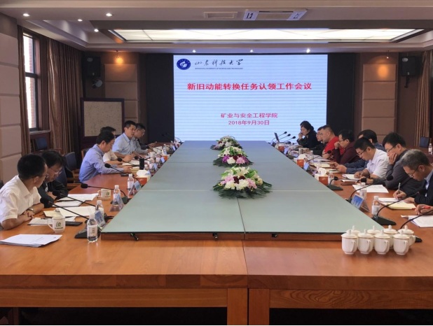 9 月 30 日,在 J4-322 召开新旧动能转换任务认领工作会议,校合作发展处处长吴正龙、矿业学院党委书记梁赛江、院长谭云亮等学院领导班子成员,各系主任及教师代表出席会议。会议由梁赛江主持。会上,采矿工程系张培森、安全工程系周刚、工业工程系贾顺、力学系谭涛分别汇报了各自专业的新旧动能转换任务对接工作方案,梁赛江、谭云亮、陈连军等分别对对接工作方案提出了建议和意见。吴正龙作会议总结指出矿业学院对接新旧动能转换任务的工作方案目标明确,方案具体,措施可行,体现了学院领导及全院教师的高度重视,希望学院继续将人才培养作为第一要务,重视科学研究,加强人才团队建设,提升社会服务能力,早日将新旧动能转换的对接工作方案抓好落实、取得成效、树立品牌,推广复制。